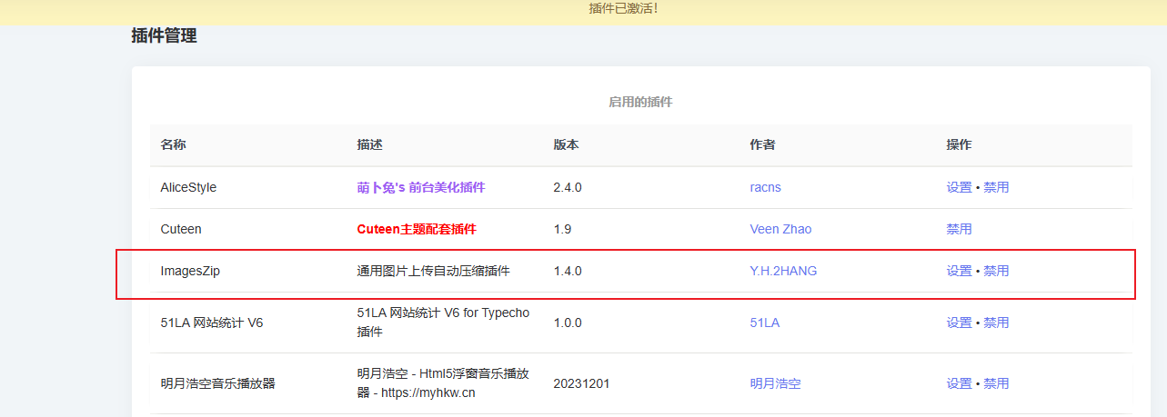 ImagesZip并上传至博客的/usr/plugins目录下。 - 在插件管理页面启用本插件。