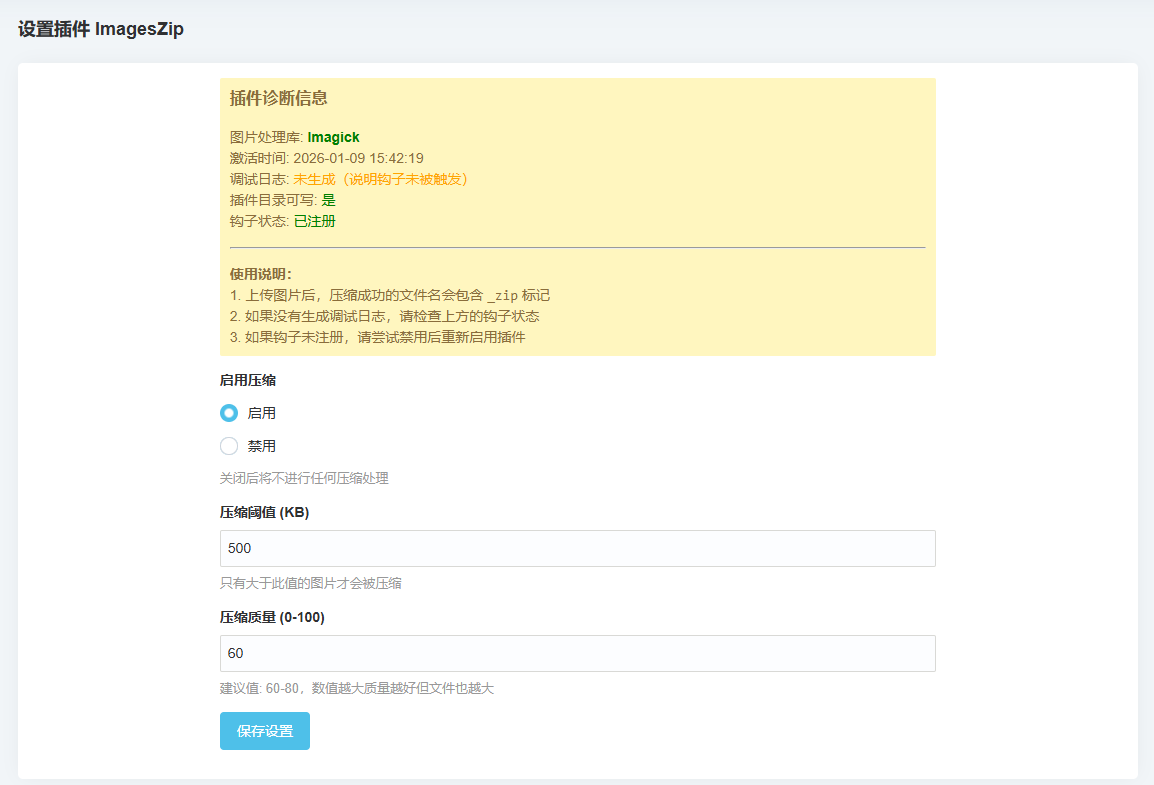 启用插件后,进入设置可以看到一些诊断信息以及压缩配置,默认配置是上传图片超过500kb的时候启用压缩,压缩60%。